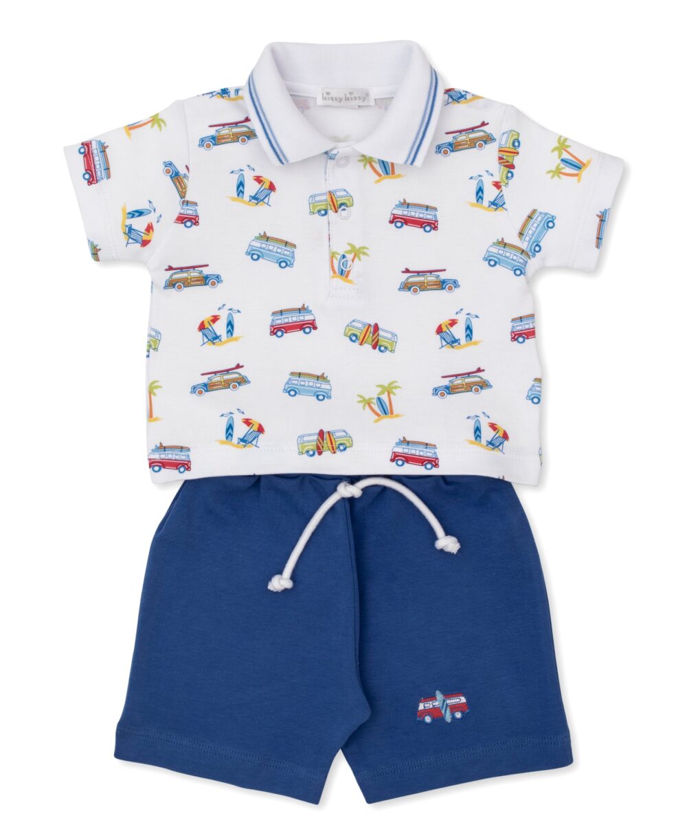 Your baby will be ready for wherever the day takes them in this adorable outfit. Made from the softest Pima cotton, our two piece set includes a polo shirt with our fun surfing vans print and coordinating bermuda shorts with a little van embellishment and drawstring waistband for easy on-off.