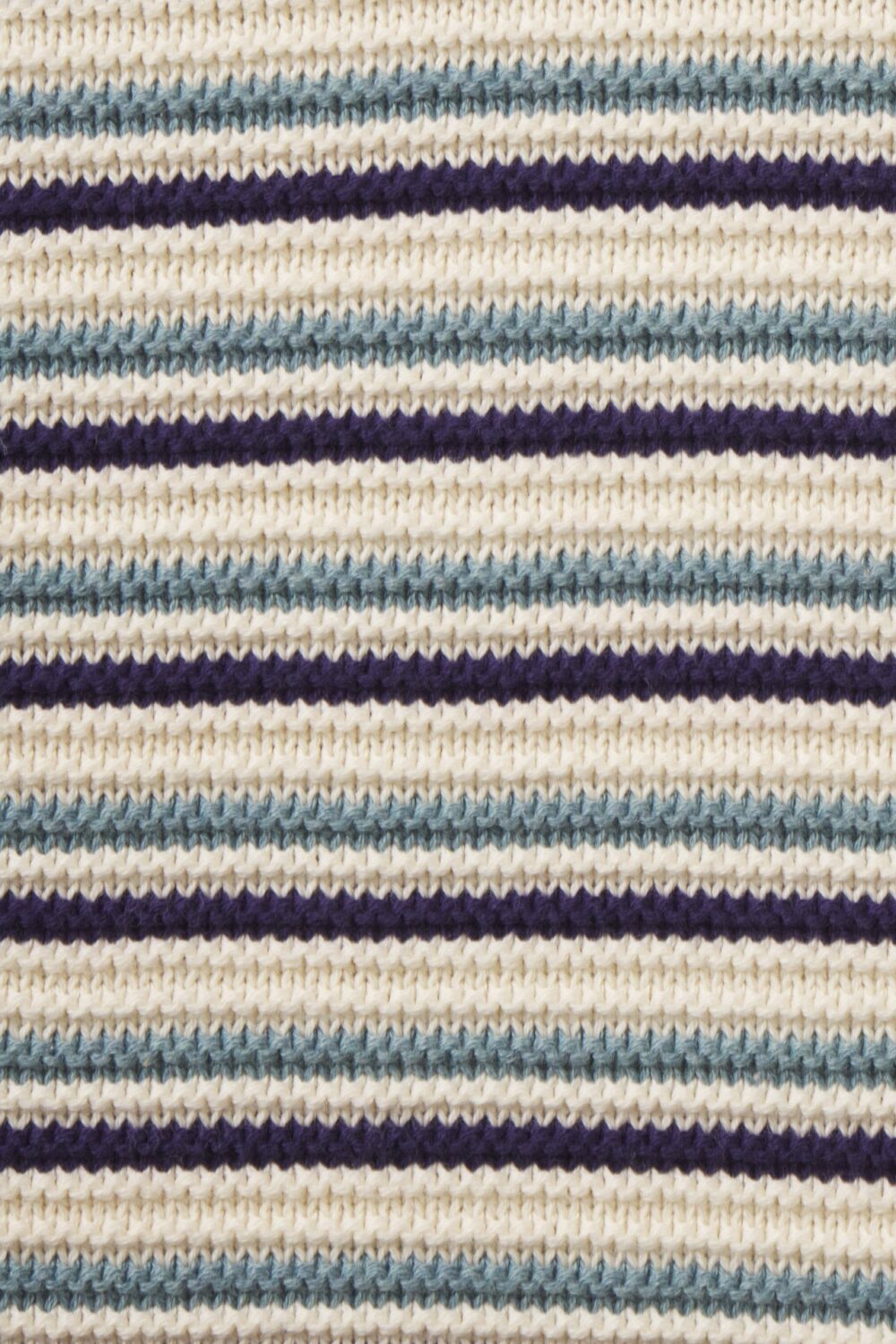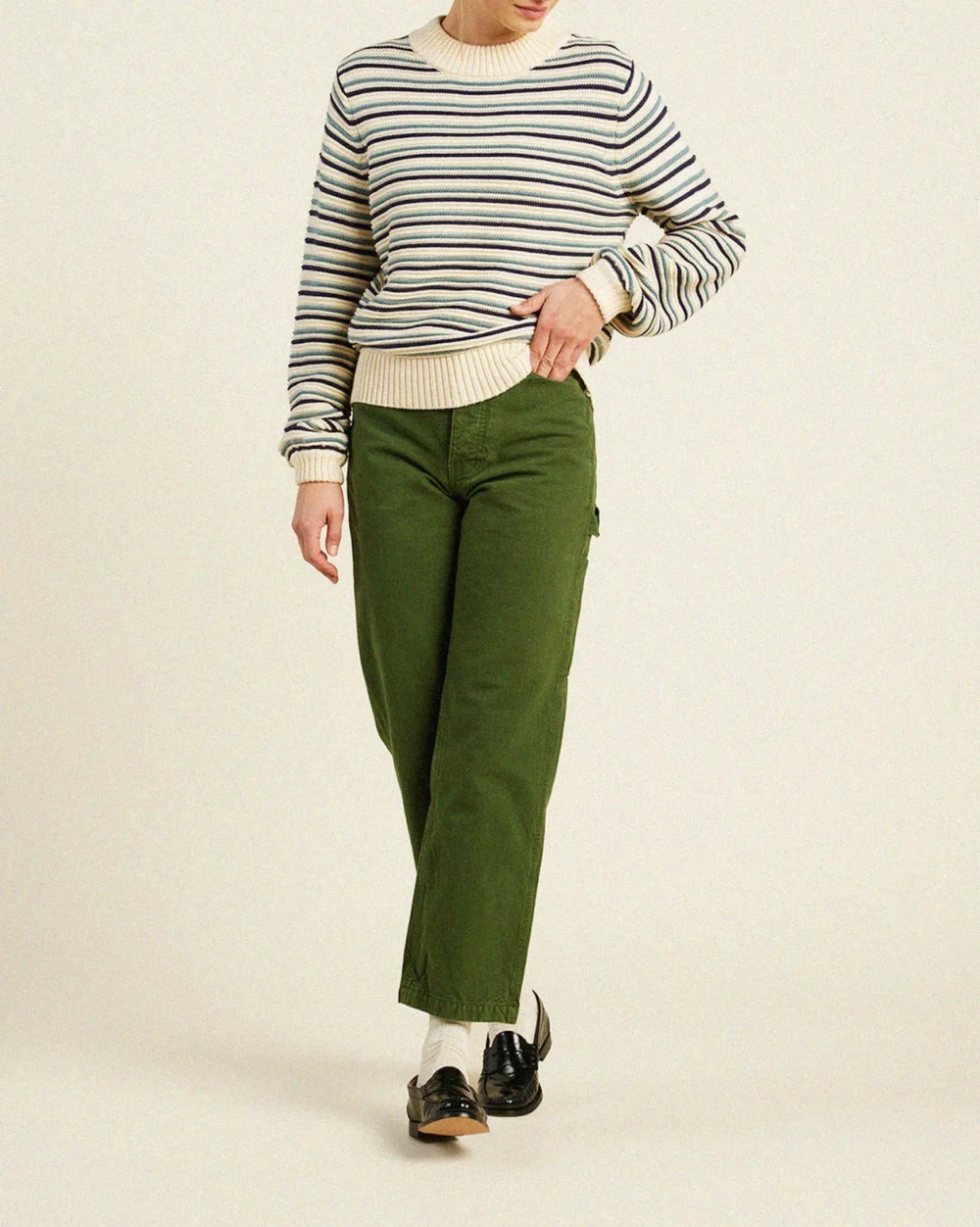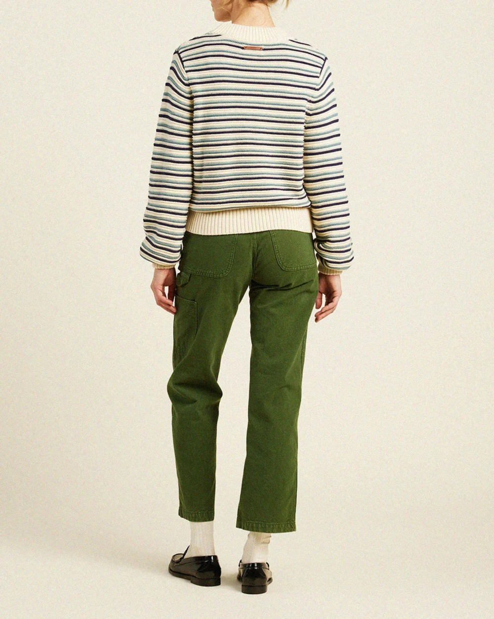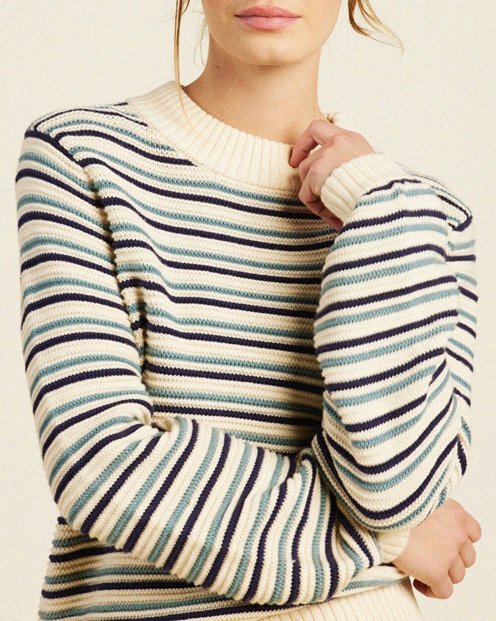 The Susan Sweater has standard body length, wide ribbed mock neck, cuffs and bottom band, subtle balloon sleeves. Trovato’s softest cotton yarns knitted in a textured micro-stripe in alternating blues and antique white. Shown here in Antique White With Navy and Green Stripe.