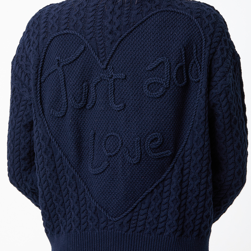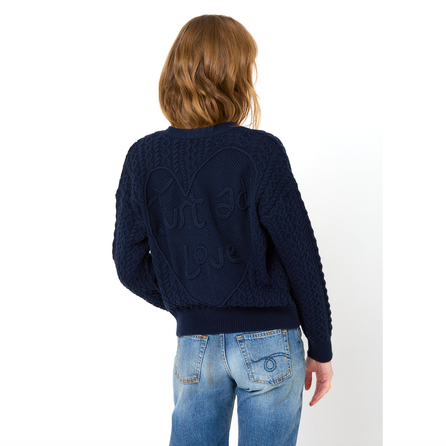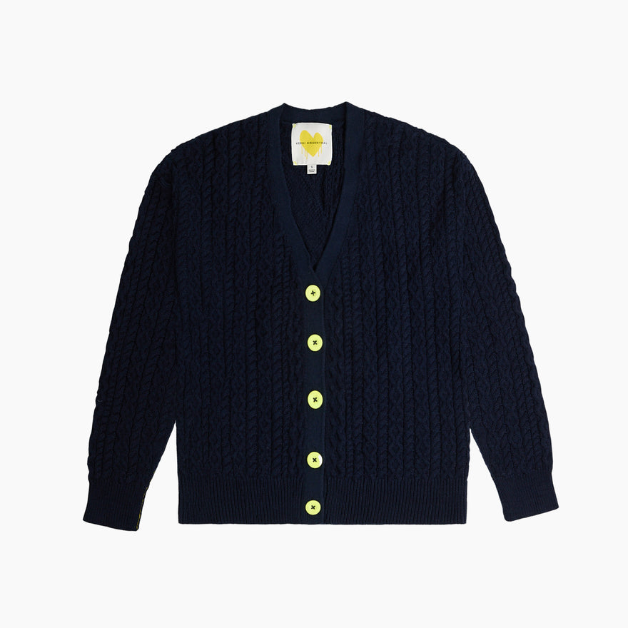The Suzanne Cardi is back! KR is now offering it in navy cotton cable stitch with “Just Add Love” braided into the back and yellow front buttons for that pop of color. This sweater fits true to size, so size up for an oversized fit.