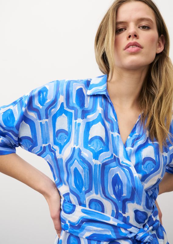 The Svenja long wrap dress made of 100% cotton has a casual cut and is comfortable to wear. With its short sleeves and fabric belt, it emphasises the waist and creates a feminine silhouette. The blue all-over print gives the dress a casual charm and is perfect for summery occasions.