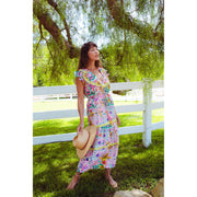 Silk cotton voile hand blocked midi dress with ruffle neckline, ruffle cap sleeves, and tassel detailing