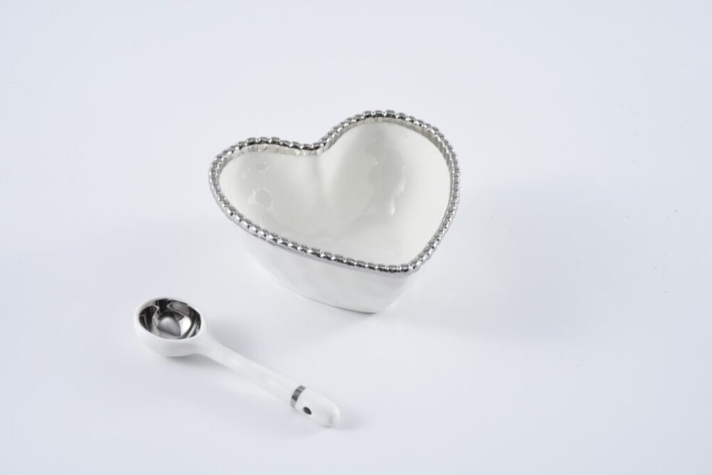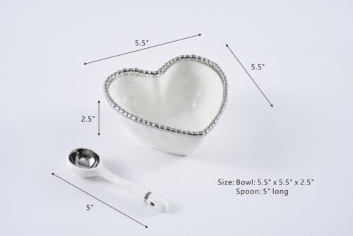 Ideal for all gifting occasions or to gift to yourself! Beautifully packaged in a magnetic closure gift box with a fun sentiment on the inside cover that can be personalized. Great for serving candies, nuts, fruit or condiments! Both bowl and spoon are made of gorgeous white porcelain with silver accents and trim.