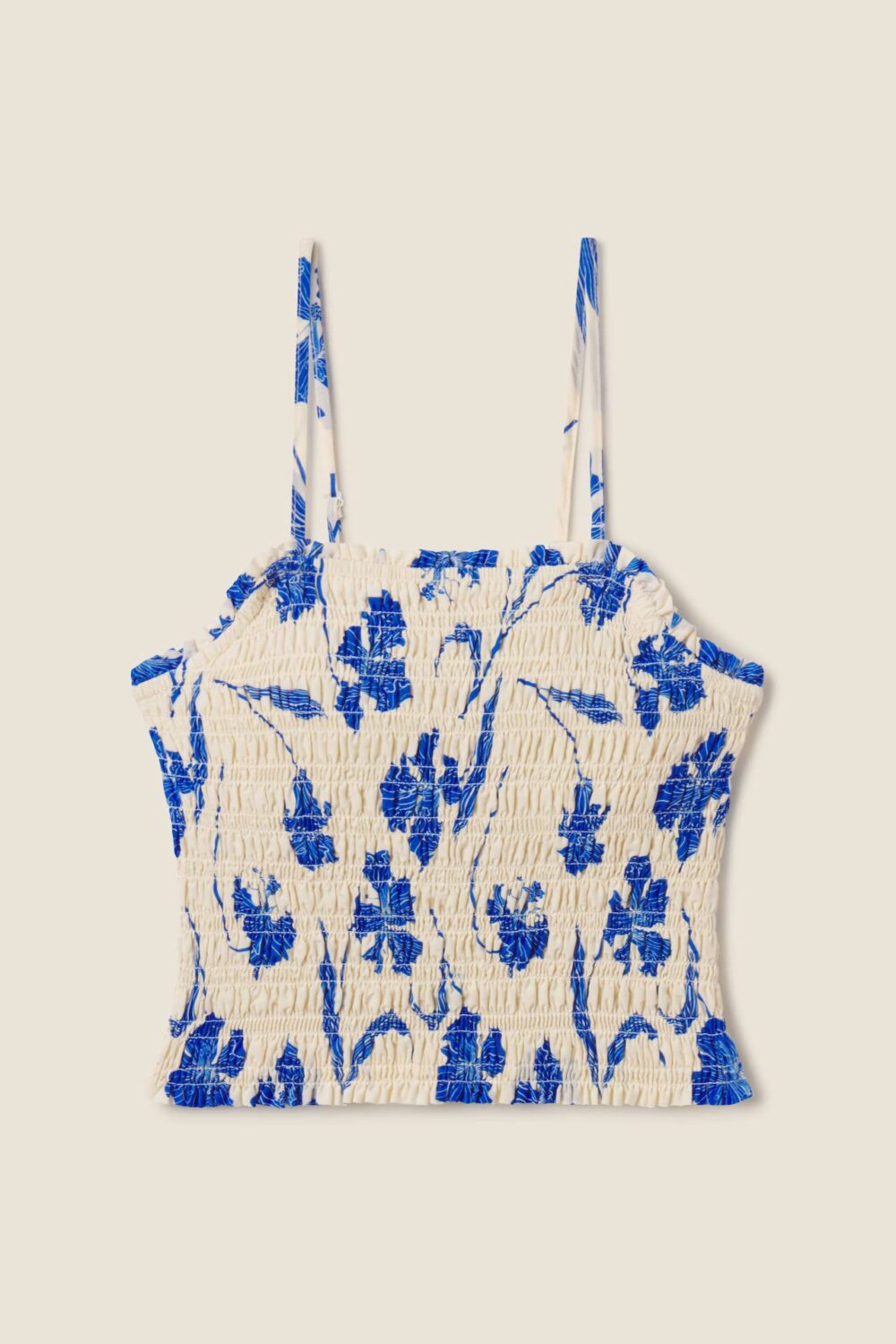 The Summer Top is a slightly copped and smocked top with adjustable and removable straps, hidden side zipper, with a flattering underarm cut and bottom hems finished with a folded ruffle. Shown here in Blue Iris and made from soft cotton viscose.