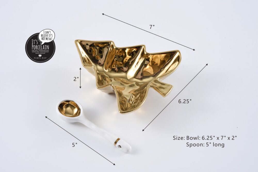 Ideal for all gifting occasions or to gift to yourself! Beautifully packaged in a magnetic closure gift box with a fun sentiment on the inside cover that can be personalized. Great for serving candies, nuts, fruit or condiments! Festive Christmas Tree-shaped bowl in stunning gold tone finished porcelain and spoon in white porcelain with gold accents. Food safe, tarnish free, dishwasher safe, oven safe to 500°. Easy Care.