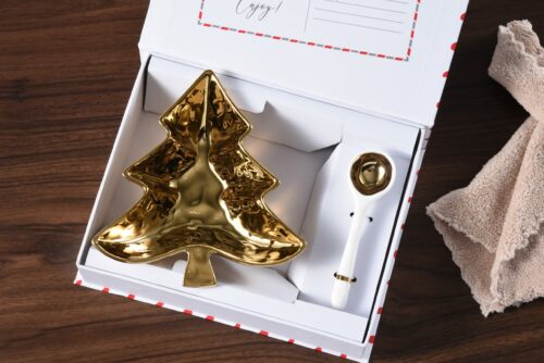 Ideal for all gifting occasions or to gift to yourself! Beautifully packaged in a magnetic closure gift box with a fun sentiment on the inside cover that can be personalized. Great for serving candies, nuts, fruit or condiments! Festive Christmas Tree-shaped bowl in stunning gold tone finished porcelain and spoon in white porcelain with gold accents.