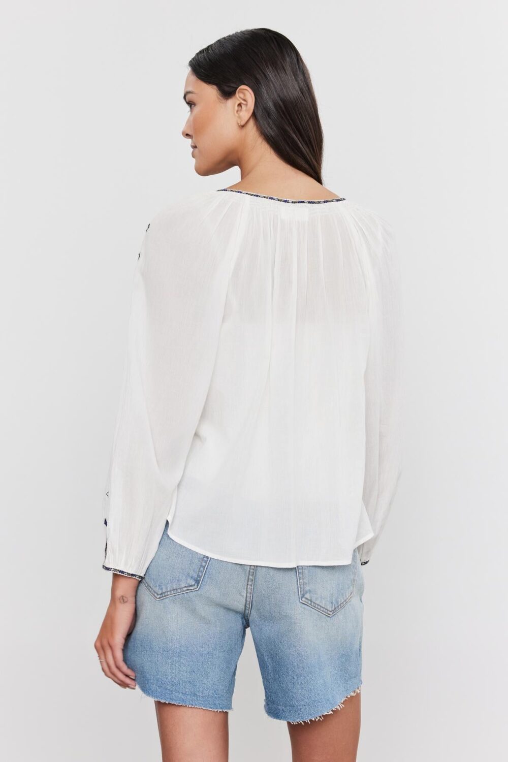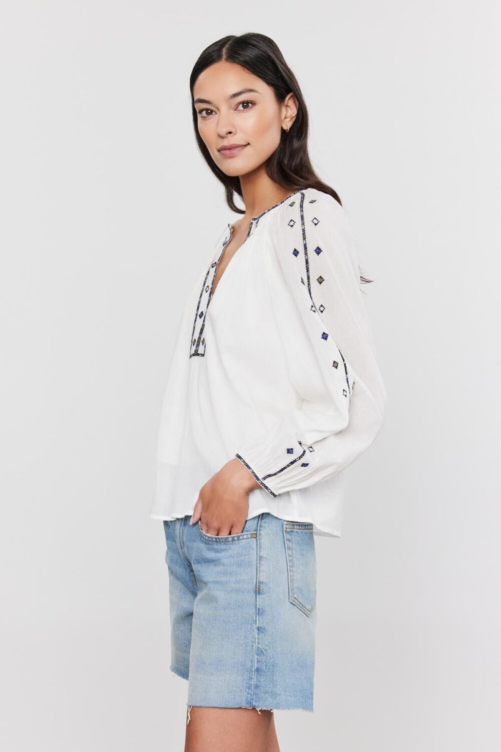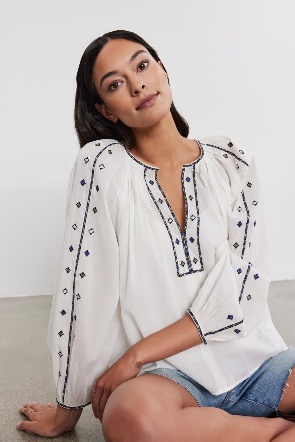 Crafted from lightweight cotton with intricate crosshatch embroidery, this top features a flattering v-neckline and delicate puff sleeves. The smocked detailing around the neckline adds texture, while the detachable camisole provides added coverage.