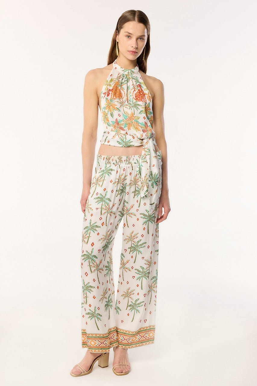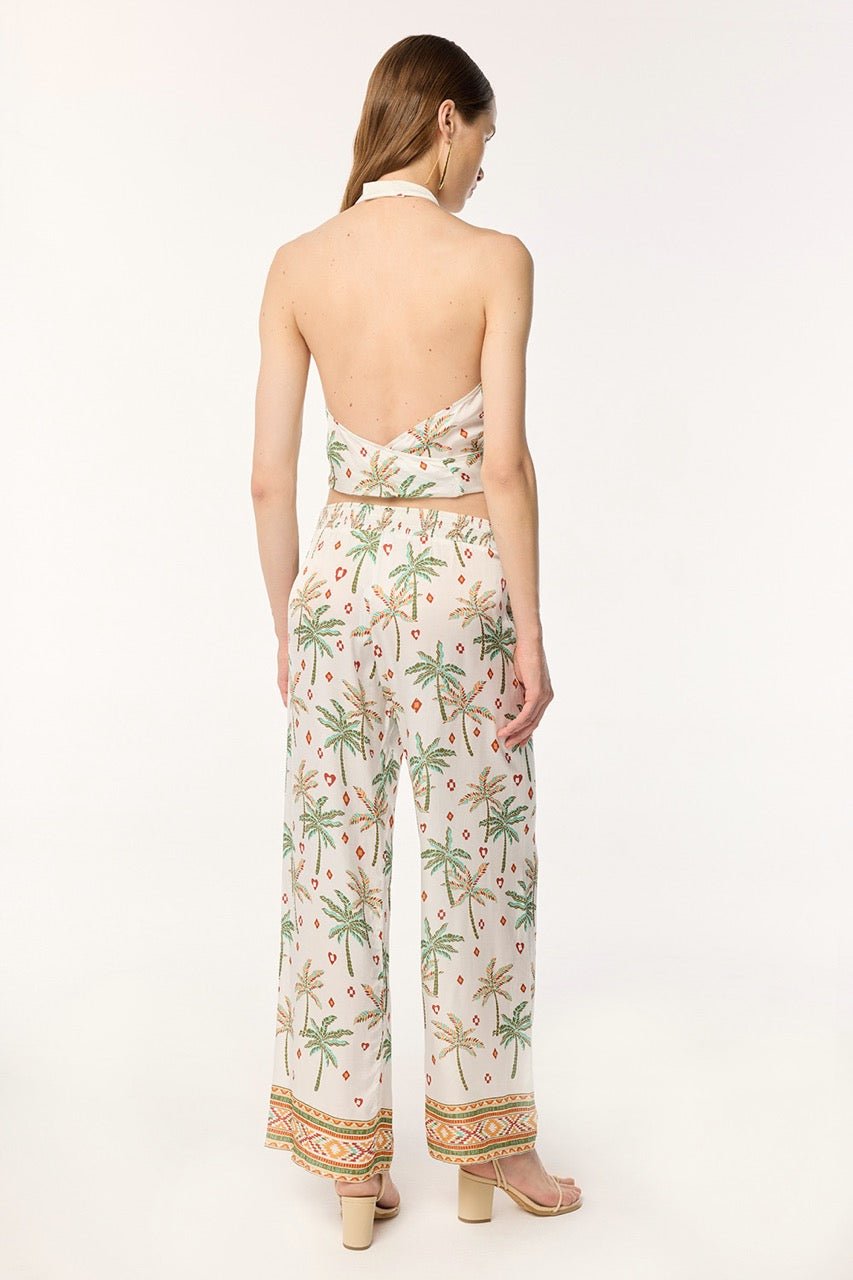 The Top Clea is a halter top that ties at the back, elegantly emphasizing the waist.