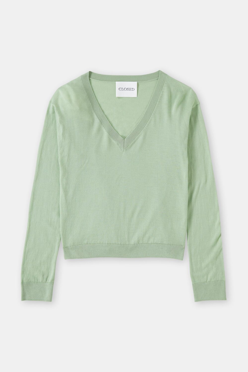 Fine knit jumper with a V-neckline is made from organic merino wool with a light silk content. This gives the relaxed fit jumper a beautiful sheen and a cool feel. Ribbed cuffs adorn the neckline, sleeves and straight hem.