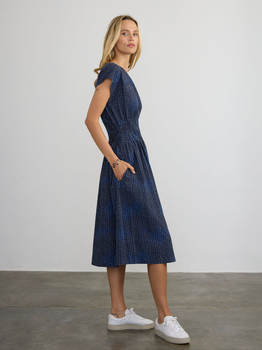 We love The Valencia for its flattering details and effortless feel. Printed, easy to wash, 100% cotton seersucker is lightweight but not sheer. Smocking at the waist provides lovely shaping and a flexible fit. Dropped shoulders create a flattering short sleeve. Midi length with hidden pockets at the side seam.