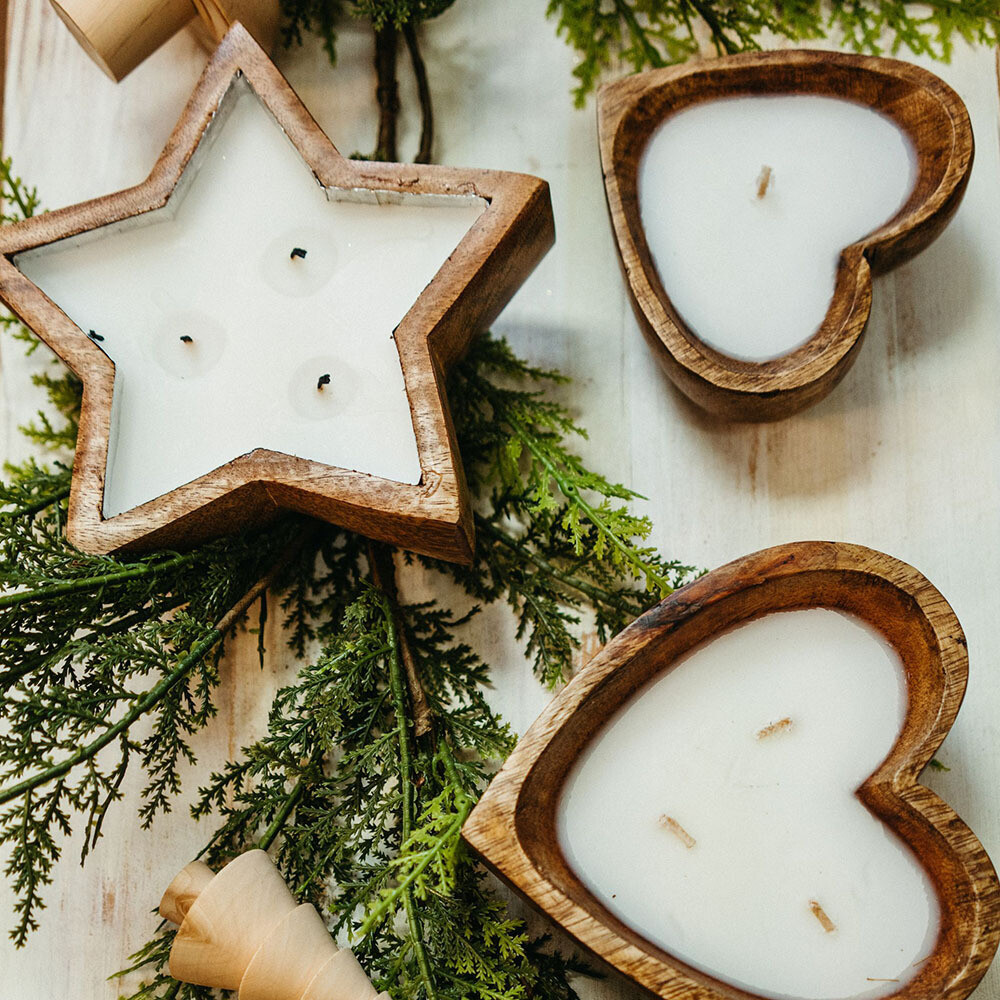 In our signature Amber Spruce fragrance, the Wooden Star Candle is made of sustainable mango wood. It represents the best of Christmas holiday nostalgia, candlelight, and the soothing smell of fragrant spruce, eucalyptus leaves, and musky amber.