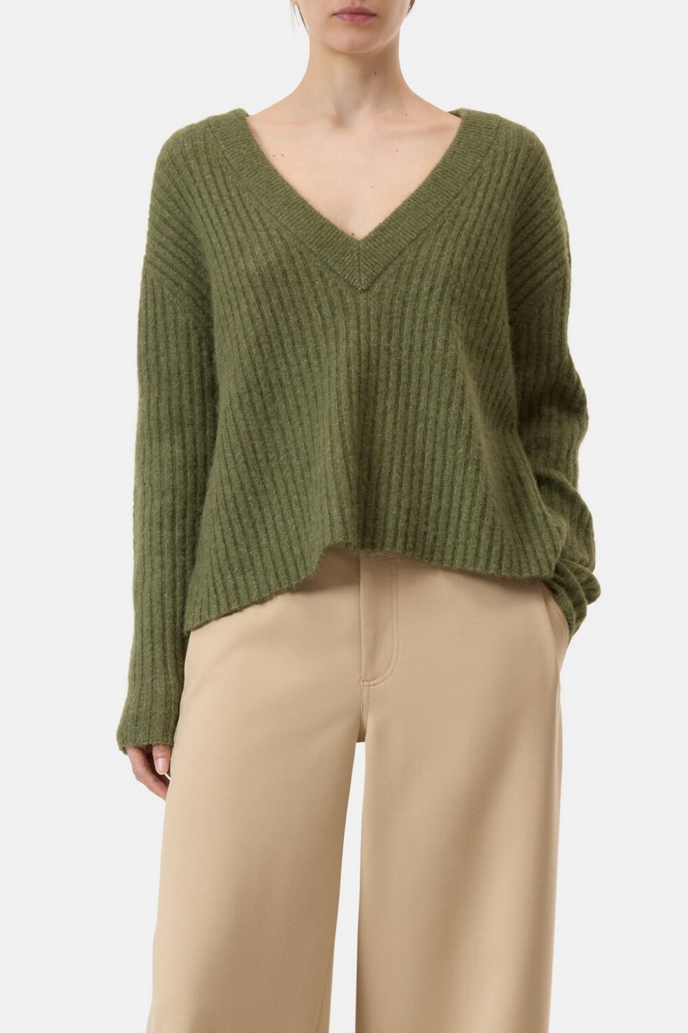 V-neck knit in a regular fit made from innovative yarn with a compact yet lightweight feel. Features a flat rib texture and refined finish. Ideal for layering thanks to its clean silhouette and comfortable construction.