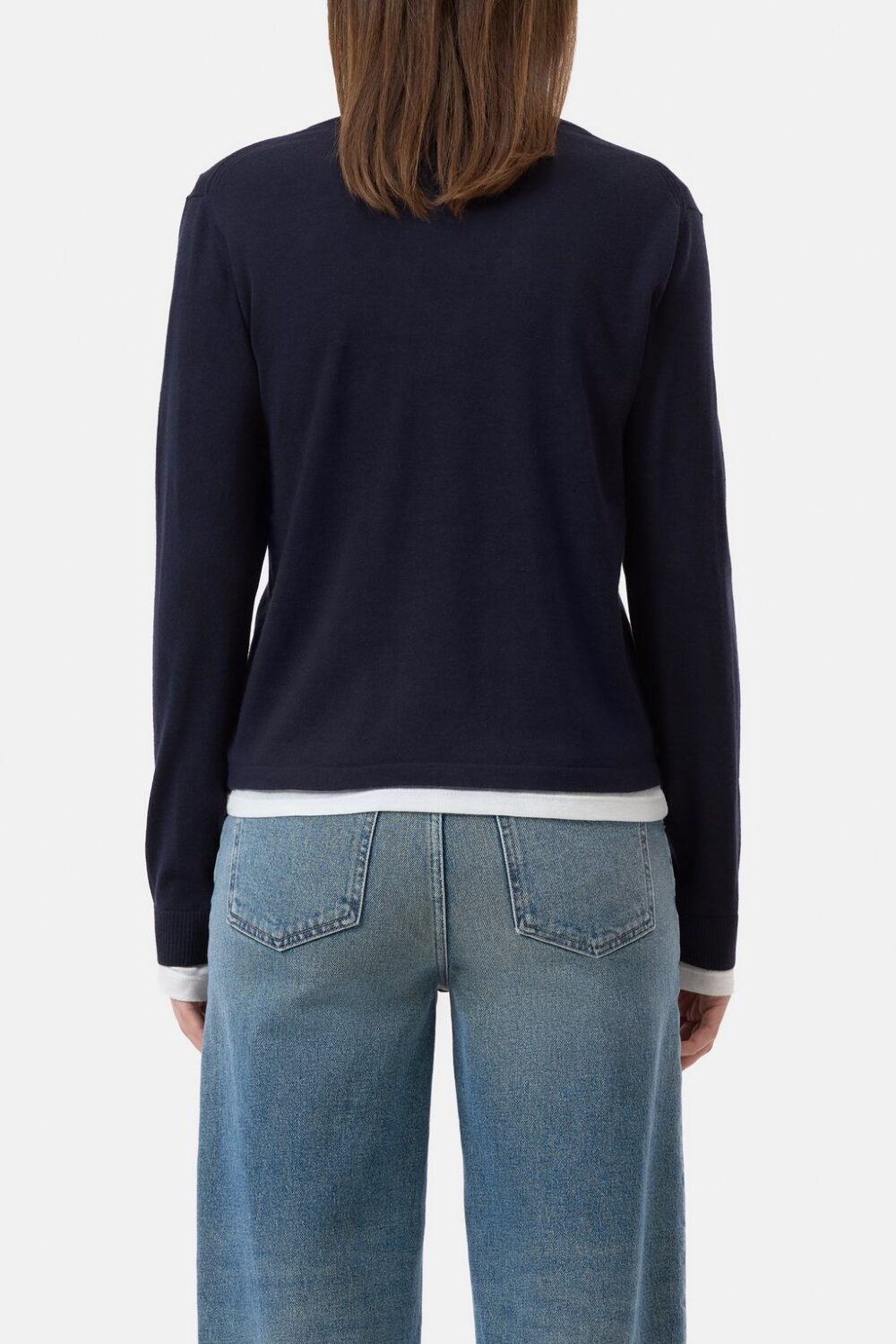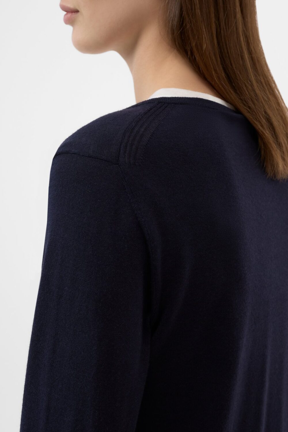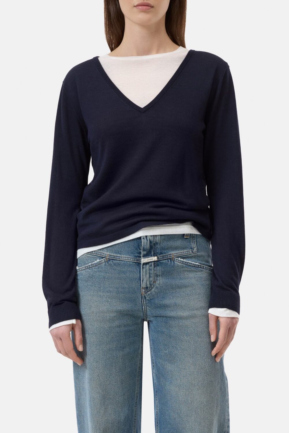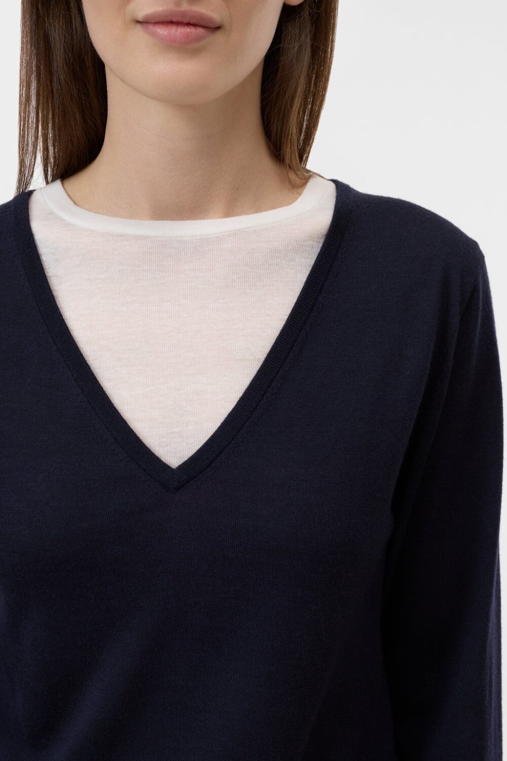 The V-neck long sleeve knit blends wool and silk for a smooth finish and subtle sheen. In a regular-fit, cropped silhouette, it features ribbed details and a fine tubular neckline for added elegance.