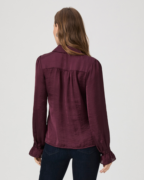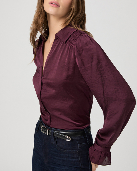 This tried and true long sleeve blouse is designed with shirring at the shoulders, a classic v-neckline, and a ruffle cuff. Crafted from buttery soft satin in black cherry, this streamlined silhouette will instantly elevate your everyday denim.