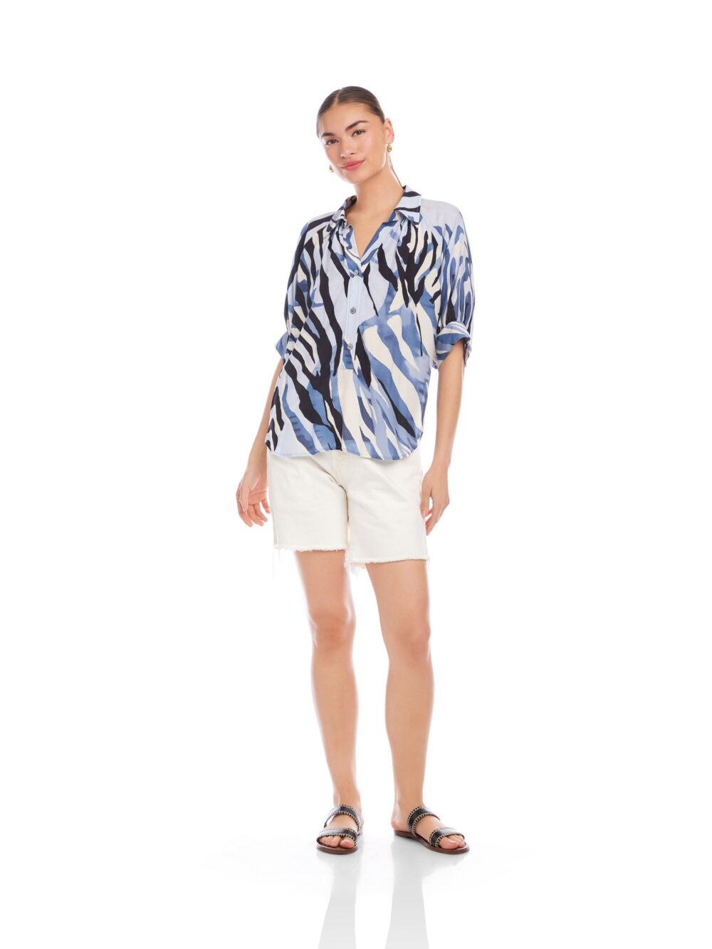 Lightweight and effortlessly polished, the Yvette Blouson Sleeve Top is crafted from an abstract print woven fabric that offers a fluid drape and airy feel. Designed with a classic collar and button-front closure, it features softly draped blouson sleeves that add subtle volume and movement.