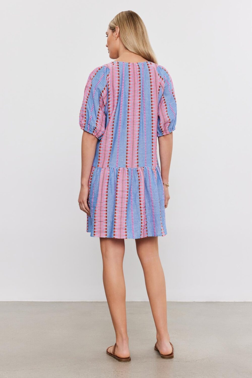 Made from vibrant cotton jacquard, it’s perfect for adding a pop of color to your wardrobe. The v-neckline and puff sleeves create a relaxed vibe, while the tiered design adds a touch of bohemian flair. Complete with inseam pockets.